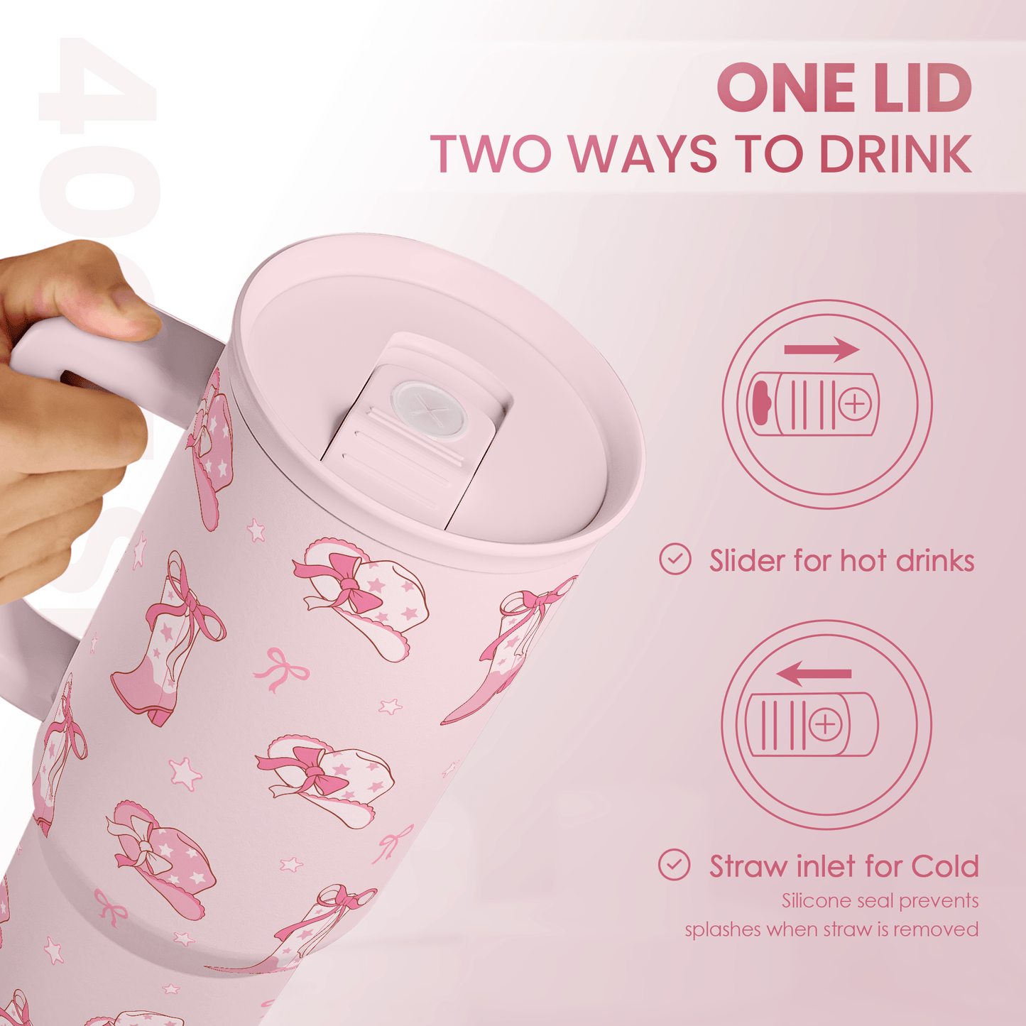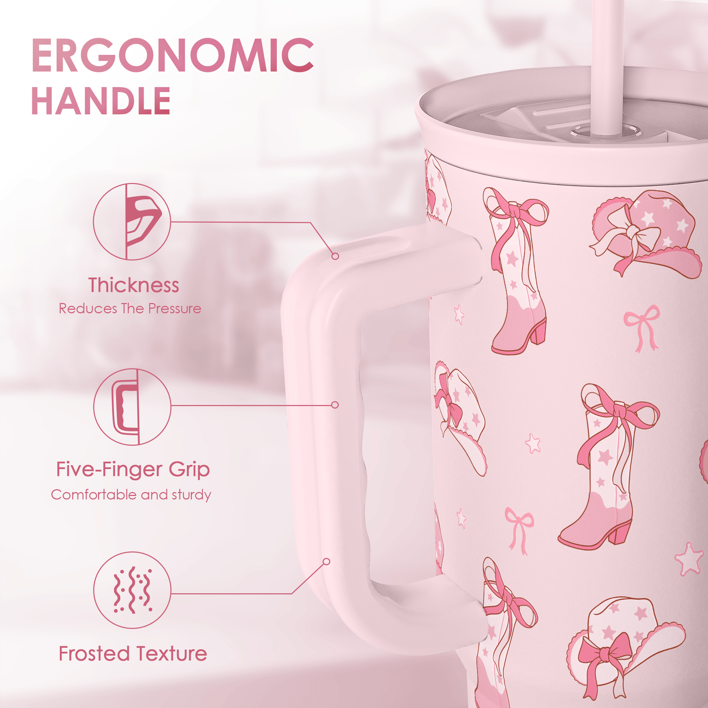 Giddy up and sip. Our Pink Cowgirl Boots 40oz Tumbler with Handle brings full yeehaw energy to your iced coffee, water, or road-trip cocktail. Covered in pink boots, hats, and stars, it’s basically a Nashville weekend in cup form. The tall, tapered shape fits most car cup holders, while the handle + straw keep it easy to carry from airport to honky-tonk.